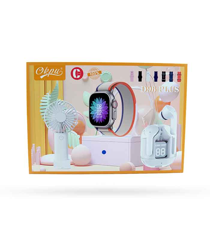 Upgrade your lifestyle with the D96 Plus Smartwatch Combo, the all-in-one smart gadget set designed for modern users who value performance, convenience, and style. This power-packed gift box includes a Bluetooth Calling Smartwatch, a compact USB rechargeable handheld fan, and a pair of TWS wireless earbuds, all beautifully arranged in a premium gift-ready package. Whether you’re buying it for yourself or gifting it to a loved one, this combo set is built to impress and perform.